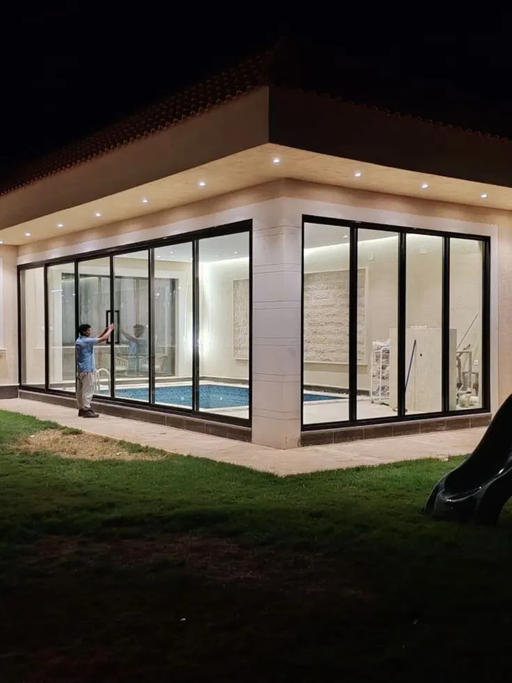 - المجالس المودرن: يتم دمج ألواح الساندوتش بنل مع واجهات زجاجية (استركشر) لإعطاء إطلالة بانورامية على الحديقة.
