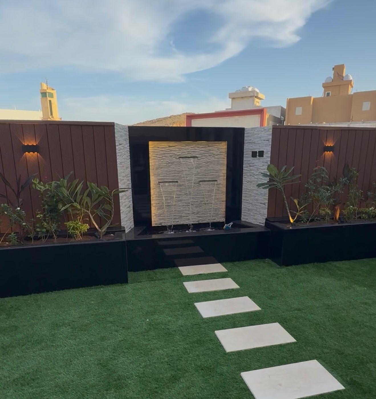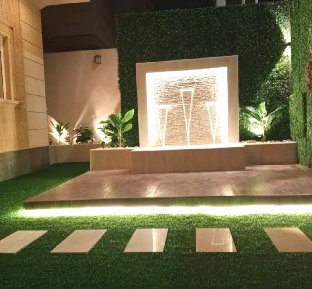 - الممرات والأرضيات: استخدام حجر طبيعي، أو بلاط إنترلوك، أو خيارات العشب الصناعي والجداري التي تتطلب صيانة أقل وتتحمل حرارة المنطقة.
