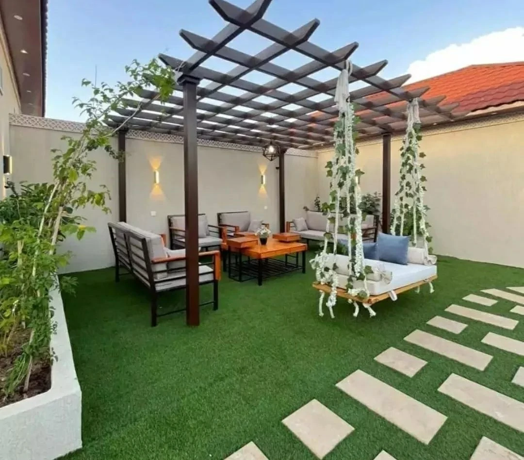 - مناطق الجلوس (الجلسات الخارجية): تصميم مناطق مظللة باستخدام برجولات خشبية أو سواتر مودرن لتوفير الخصوصية والحماية من الشمس.