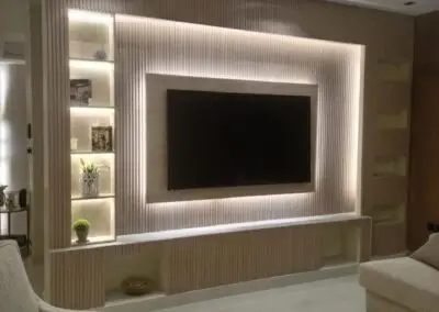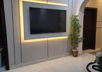 - 💡 الإضاءة المخفية: تُعد الإضاءة العنصر السحري في تصميم الشاشات. استخدام شرائط الـ LED المخفية خلف الألواح الخشبية أو بديل الرخام، أو حول محيط الشاشة، يضيف عمقاً ويقلل من إجهاد العين ويبرز جمال الخامات المستخدمة.