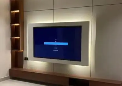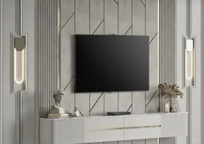 تصاميم الشاشات لم تعد مجرد تثبيت، بل أصبحت قطع فنية متكاملة تستخدم الألواح الجدارية والرفوف العائمة لخلق بؤرة بصريةأنيقة وعملية، مع التركيز على الألوان الهادئة والملمس المتقن.