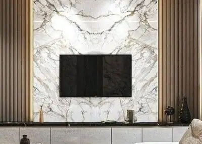 - 🖼️ جدار الشاشة كتحفة فنية: يتم تصميم هذا الجدار ليكون هو البؤرة البصرية. يُستخدم فيه دمج بين خامات مختلفة (مثلاً: إطار من بديل الخشب يحيط بقطعة من بديل الرخام)، مع دمج الرفوف العائمة،لعرض التحف أو النباتات الصغيرة، مما يكسر حدة الجدار ويضيف مساحة تخزين أنيقة.