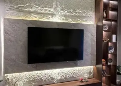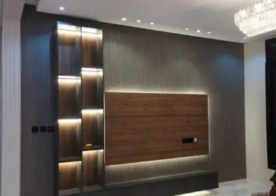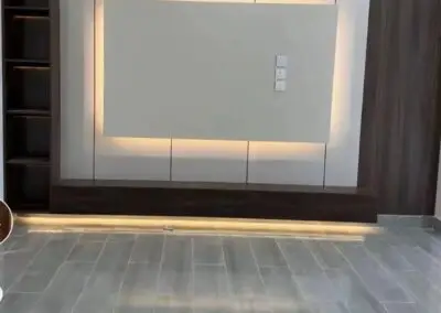 - 💡 الإضاءة المخفية: تُعد الإضاءة العنصر السحري في تصميم الشاشات. استخدام شرائط الـ LED المخفية خلف الألواح الخشبية أو بديل الرخام، أو حول محيط الشاشة، يضيف عمقاً ويقلل من إجهاد العين ويبرز جمال الخامات المستخدمة.