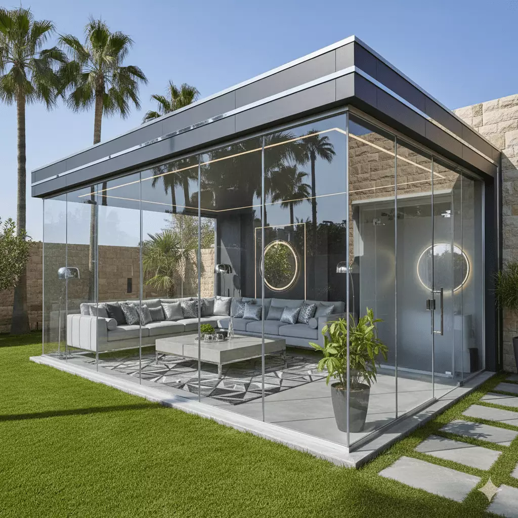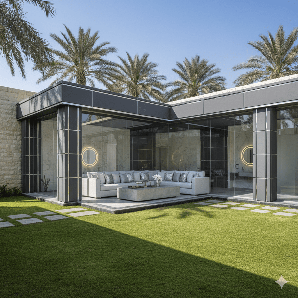 - التصميم الزجاجي : استخدام الواجهات الزجاجية الكبيرة التي تطل على الحديقة أو المسبح يمنح شعوراً بالاتساع والفخامة.
